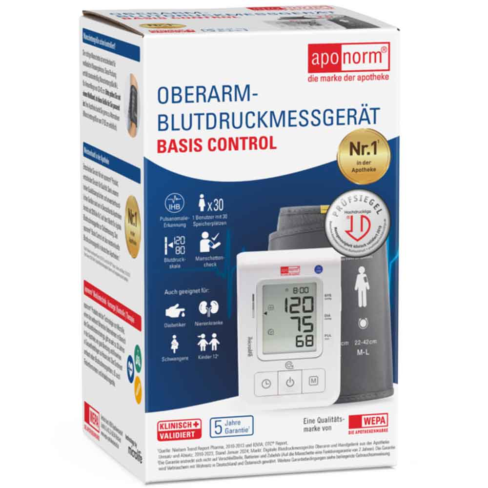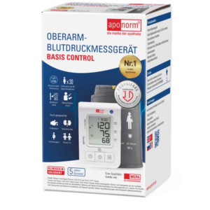 Das aponorm® Basis Control ist deutschlandweit das meistverkaufte Blutdruckmessgerät.* Und das nicht ohne Grund: Es bringt alles mit, was Sie für eine schnelle, verlässliche Blutdruckmessung benötigen – und das noch zum kleinen Preis. Bei Vorlage eines ärztlichen Rezeptes erhalten Sie mit geringer oder gar keiner Zuzahlung Top-Qualität vom Marktführer.